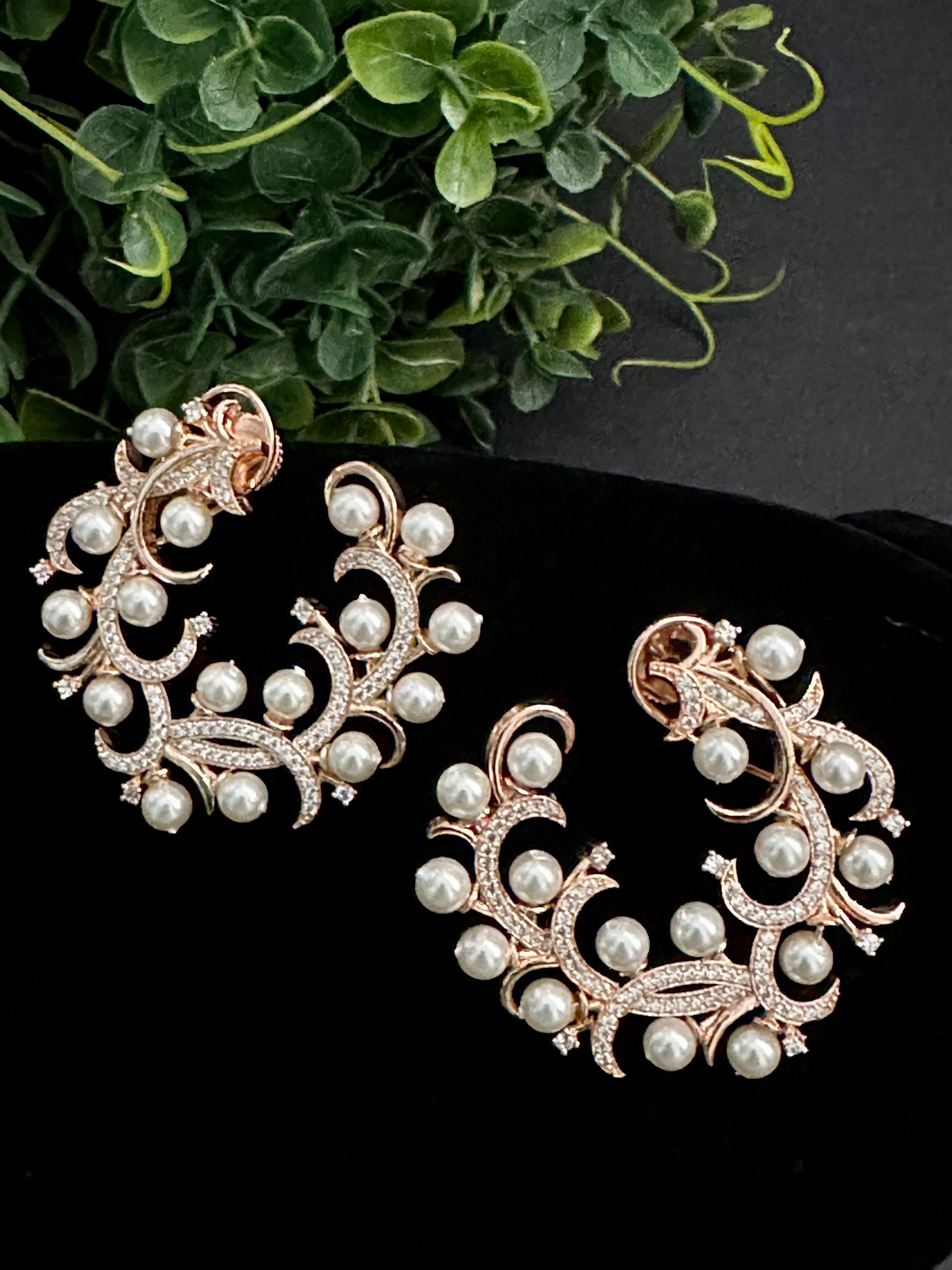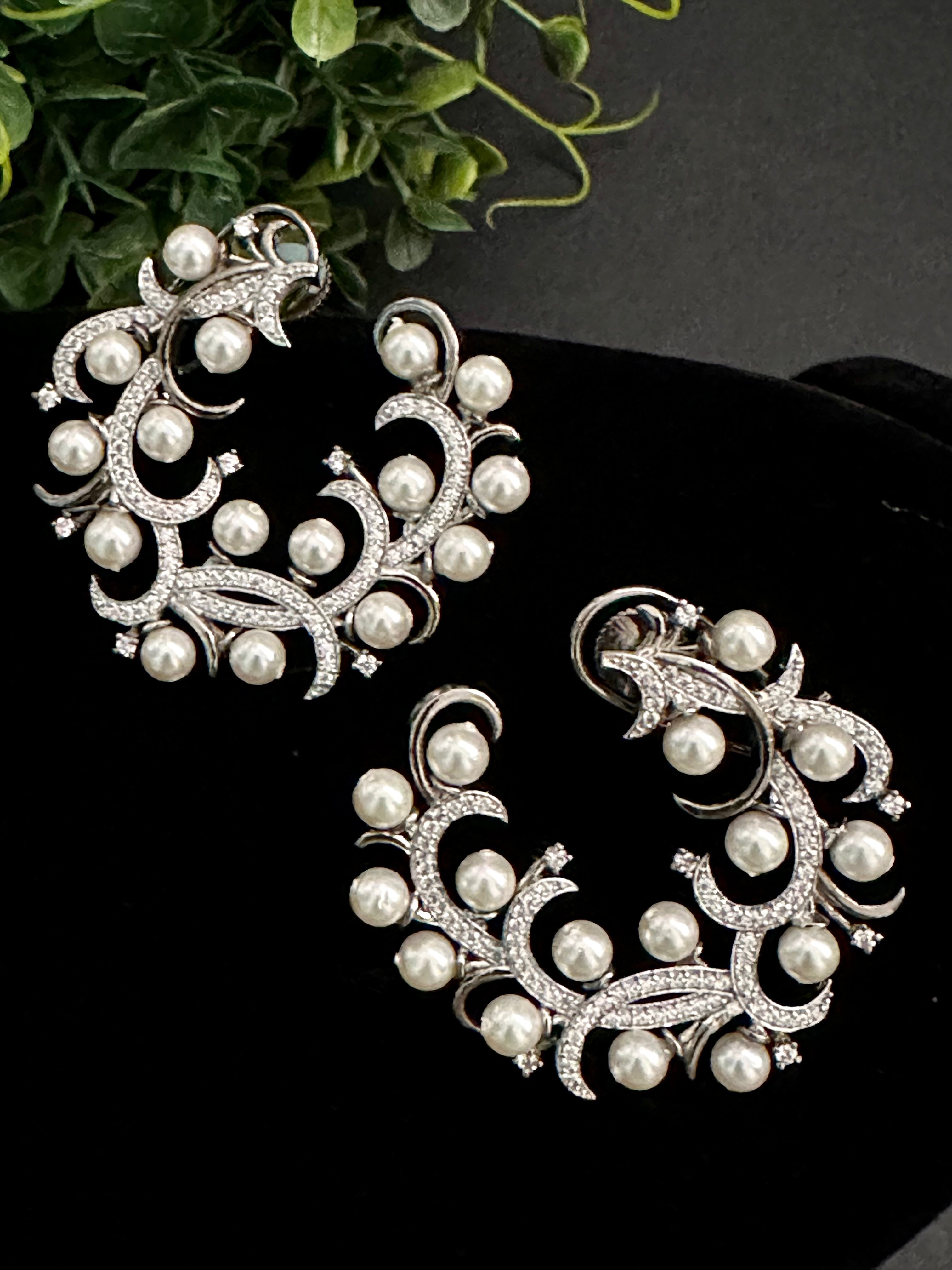 • Crescent shaped CZ studs embellished with pearls