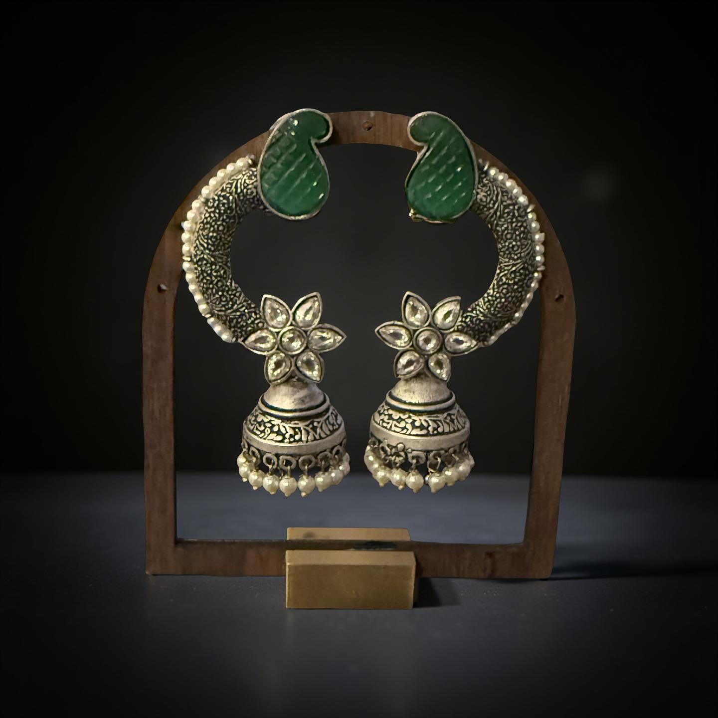 • Silver finish hand carved mango design jhumka